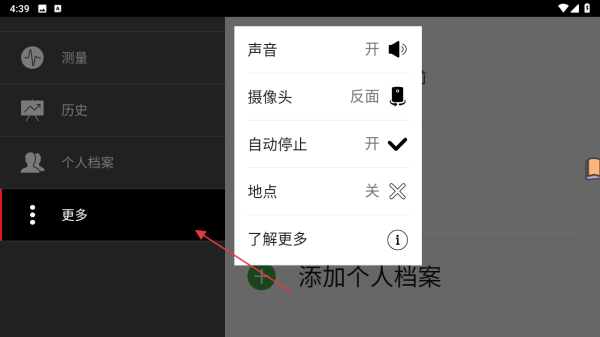 3、若需進(jìn)一步設(shè)置檔案相關(guān)參數(shù),點(diǎn)擊左側(cè)菜單欄中的更多選項(xiàng),在展開(kāi)的設(shè)置項(xiàng)中,可對(duì)聲音、攝像頭、自動(dòng)停止、地點(diǎn)等進(jìn)行設(shè)置,完善個(gè)人檔案的使用偏好。