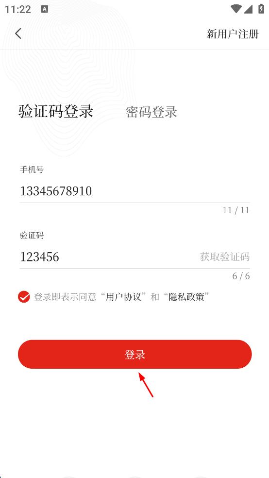 4、輸入完驗證碼后,勾選“登錄即表示同意‘用戶協(xié)議’和‘隱私政策’”,最后點擊紅色的“登錄”按鈕,即可完成登錄。