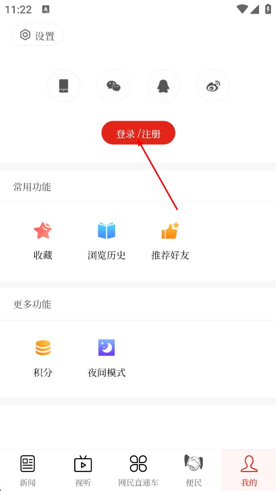 2、在個人中心頁面,找到紅色的“登錄/注冊”按鈕,點擊該按鈕,進入登錄頁面。