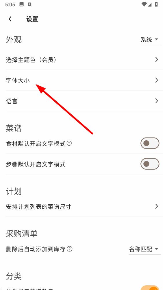 3、在設(shè)置頁面里,找到字體大小選項并點擊,進(jìn)入字體修改。