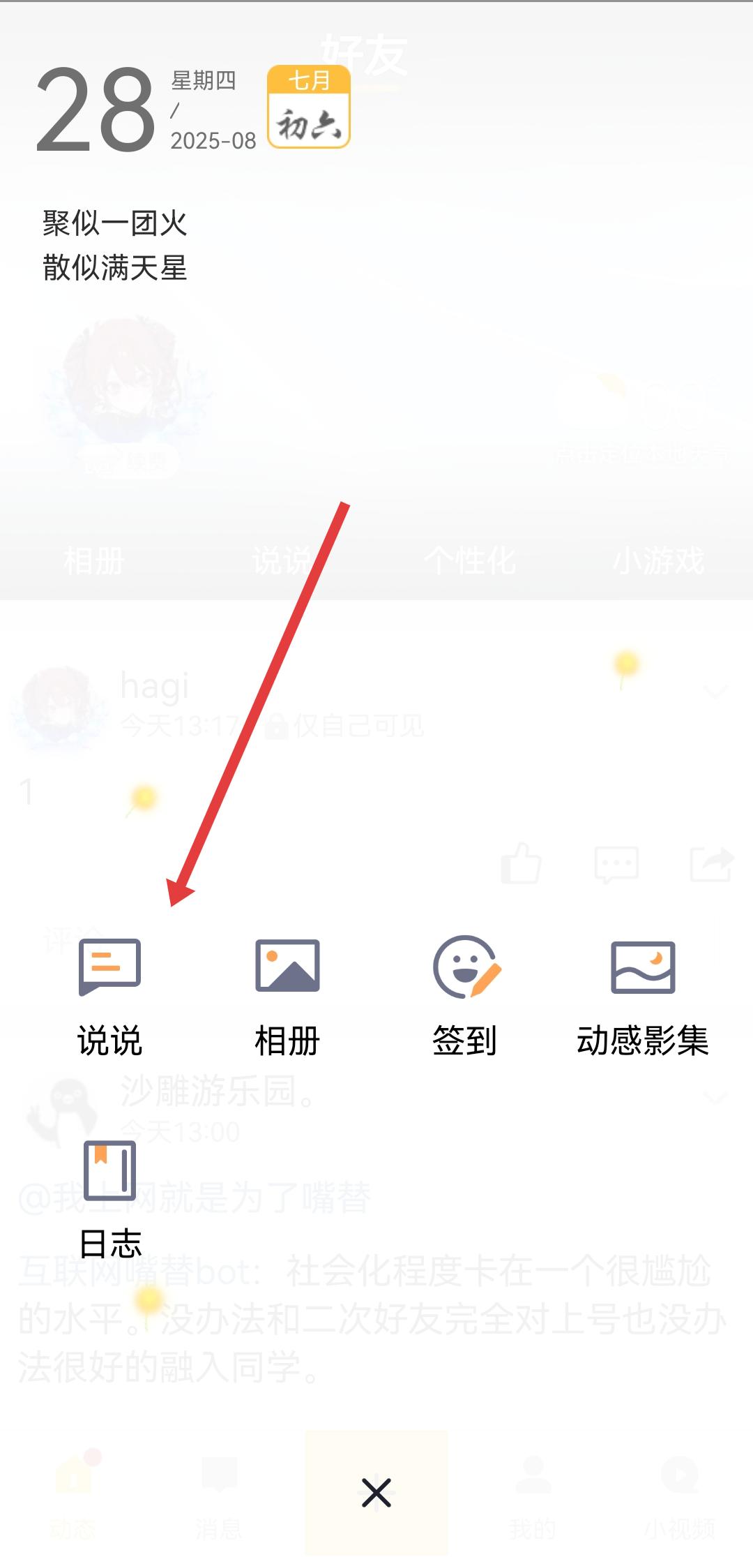 1、打開qq空間,需要在動(dòng)態(tài)發(fā)布選項(xiàng)中點(diǎn)擊說(shuō)說(shuō),如何進(jìn)入寫說(shuō)說(shuō)的編輯頁(yè)面。