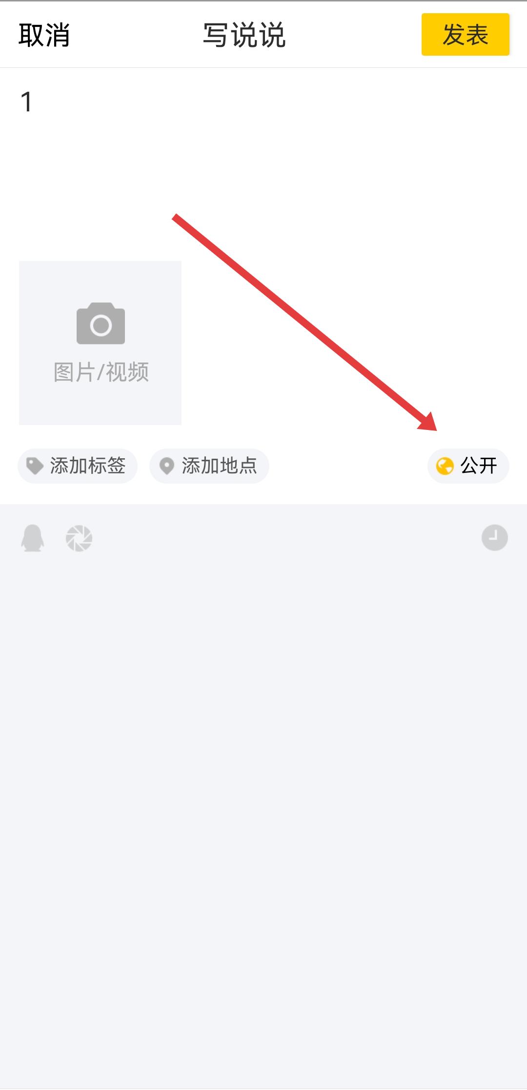2、在寫說(shuō)說(shuō)頁(yè)面中,找到并點(diǎn)擊右下角的公開按鈕,進(jìn)入誰(shuí)能看見(jiàn)的權(quán)限設(shè)置界面。