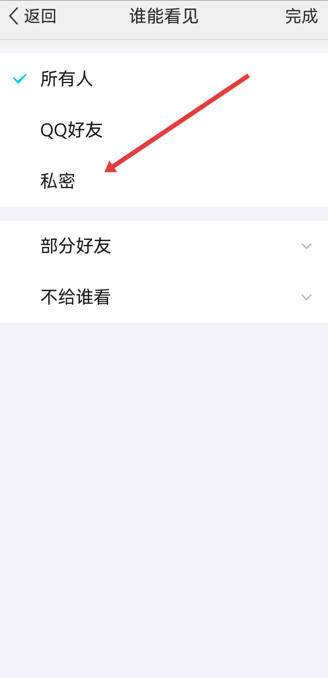 3、在誰(shuí)能看見(jiàn)的頁(yè)面里,需要點(diǎn)擊私密的選項(xiàng),設(shè)置完成后,這條說(shuō)說(shuō)將僅自己可見(jiàn)。