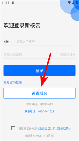 1、打開新核云APP,在登錄的頁面需要點擊設(shè)置域名。