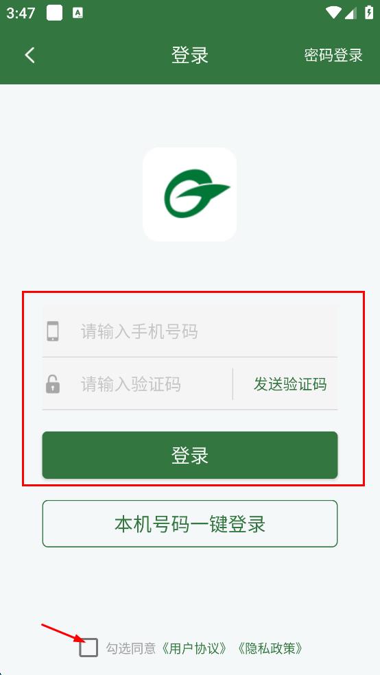 4、在登錄界面輸入手機(jī)號(hào)碼,點(diǎn)擊發(fā)送驗(yàn)證碼,輸入驗(yàn)證碼,勾選同意相關(guān)協(xié)議后點(diǎn)擊登錄,完成登錄操作。