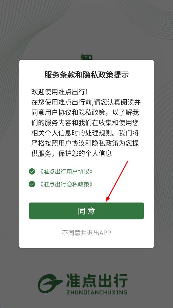 1、打開準(zhǔn)點(diǎn)出行,彈出服務(wù)條款和隱私政策提示,點(diǎn)擊同意,進(jìn)入軟件首頁(yè)。