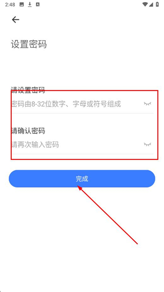 4、輸入密碼并確認,點擊完成,完成賬號和密碼的注冊。