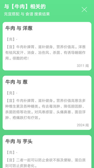 食品相宜相剋:由專業(yè)營養(yǎng)師整理過的食品相宜相剋數(shù)據(jù),最全的食物搭配禁忌信息,吃東西不僅講究色香味,還應(yīng)該注重科學(xué)的健康搭配。