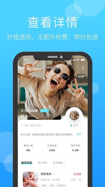 2、支持按摩推拿、減壓SPA、足療足浴等服務選項,支持技師人員信息查看,幫助隨時緩解身心疲勞;