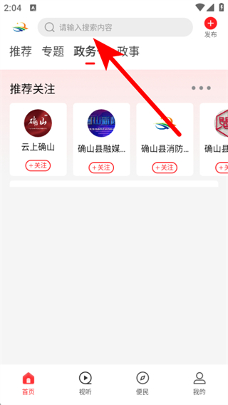 1、在云上確山的首頁(yè),點(diǎn)擊頂部的搜索欄,進(jìn)入搜索的界面。