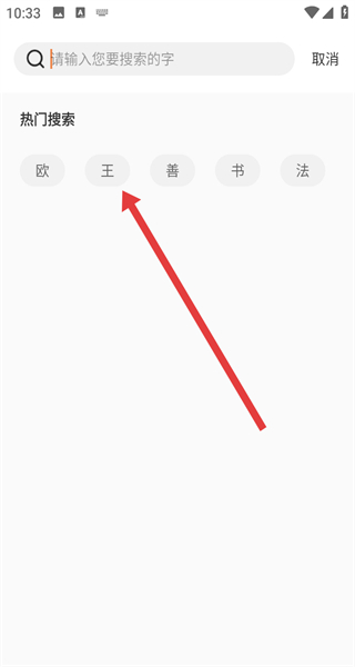3、在搜索界面,可直接輸入要搜索的字,或點擊熱門搜索中的字如“王”,進入搜索結(jié)果界面。