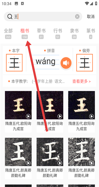 4、在搜索結(jié)果界面,可選擇字體類型如楷書,查看對應(yīng)字體的詳細信息和書法作品示例。