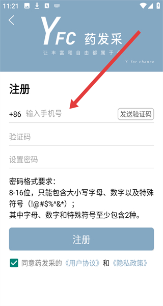 1、點(diǎn)擊“用戶隱私政策”彈窗的“同意”,進(jìn)入藥發(fā)采登錄頁面。