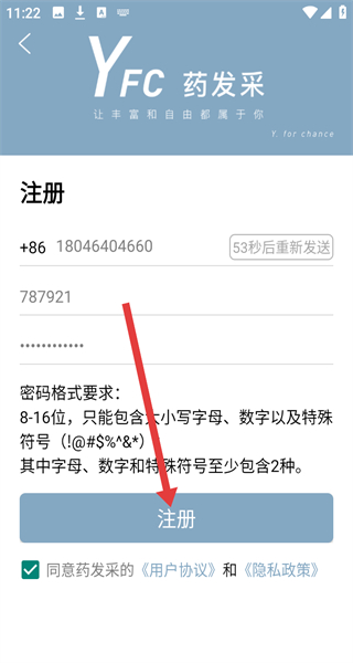 4、輸入收到的驗(yàn)證碼,設(shè)置密碼,點(diǎn)擊“注冊(cè)”,完成賬號(hào)注冊(cè)操作。