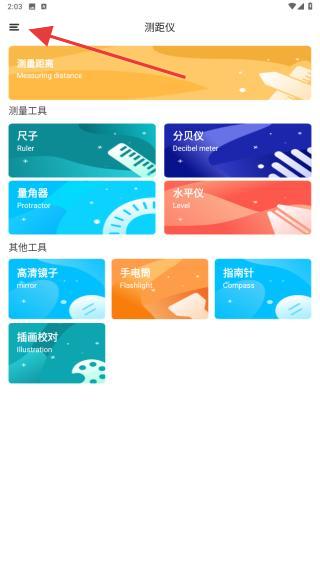 1、打開測量儀尺子工具APP,在首頁左上角點擊三個橫線的圖標(biāo)。