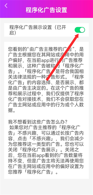 4、在頁面關(guān)閉程序化廣告展示設(shè)置的開關(guān),完成關(guān)閉操作。
