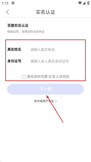 3、輸入真實姓名和身份證號,勾選同意實名認(rèn)證規(guī)則,點擊下一步,完成后續(xù)認(rèn)證步驟即可。
