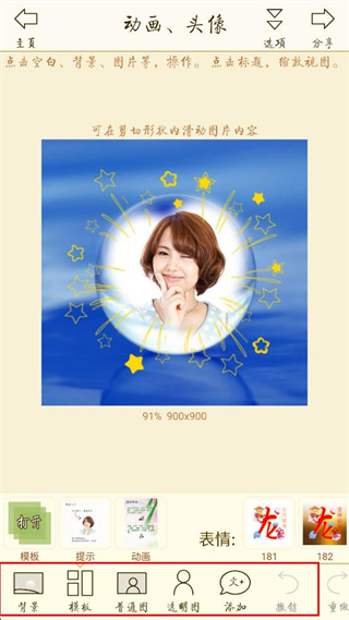 2、在動畫頭像制作頁面,利用背景、模板等功能制作動畫頭像。