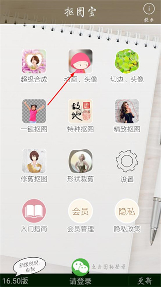 1、打開摳圖寶APP主界面,點(diǎn)擊動畫、頭像選項(xiàng)進(jìn)入動畫頭像制作頁面。