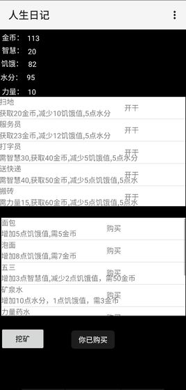 擁有成為億萬富翁夢想的你來到了夢想鄉(xiāng),這個日記里,記錄著你成為億萬富翁的經(jīng)歷。在不斷賺金幣的過程中,你要確保自己不會死亡。