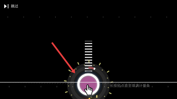 3、面對(duì)紫色拍點(diǎn),長(zhǎng)按拍點(diǎn)區(qū)域,直至計(jì)量條填滿(mǎn),完成長(zhǎng)按操作以獲取游戲分?jǐn)?shù)。