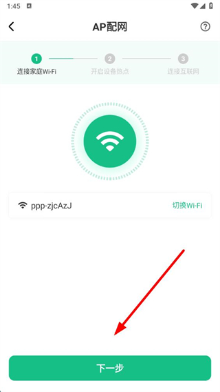 3、進入AP配網(wǎng)頁面,確認(rèn)連接的家庭Wi-Fi,點擊下一步。