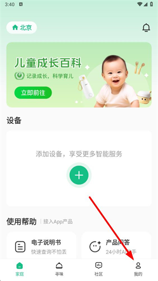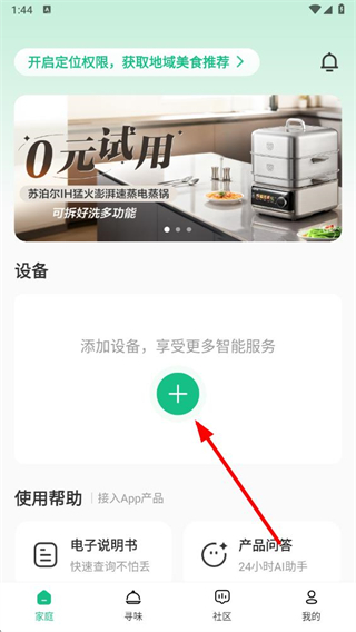 1、打開蘇泊爾APP,在設(shè)備區(qū)域點擊綠色加號按鈕,進入添加設(shè)備頁面。