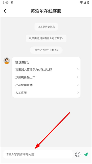 3、在蘇泊爾在線客服界面里,可選擇猜您想問的選項,或在輸入框填寫咨詢內(nèi)容后發(fā)送,與客服進行溝通。