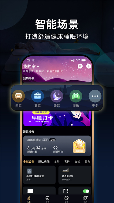 智慧慕思,慕思集團(tuán)旗下智能家居APP,集智能家居家電管理、睡眠監(jiān)測(cè)、睡眠知識(shí)科普、睡眠改善、助眠放松、寢具定制功能為一體的智能家居平臺(tái)。