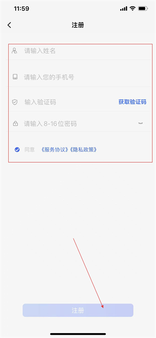 2、在注冊頁面輸入姓名、手機號,填入驗證碼,設(shè)置密碼,勾選協(xié)議,點擊注冊。