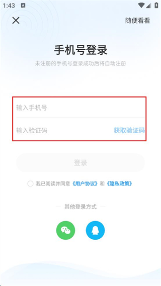 3、在手機號登錄頁面輸入手機號,點擊“獲取驗證碼”并輸入收到的驗證碼。