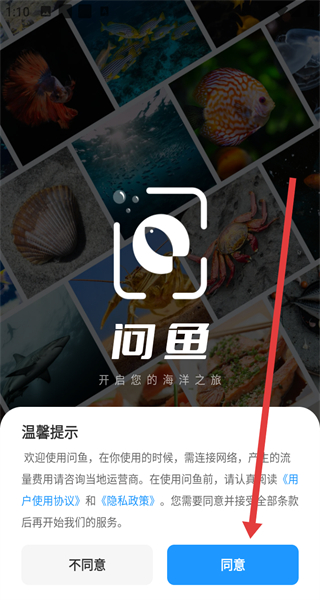 1、打開問魚APP,點擊同意按鈕,確認用戶使用協(xié)議和隱私政策,進入APP主界面。