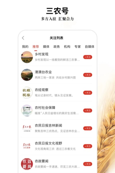 面向廣大“三農(nóng)”決策者、工作者等核心用戶,以新聞資訊的精準(zhǔn)推薦、農(nóng)業(yè)信息的直播服務(wù)、數(shù)字報的移動化展示及用戶的個性化服務(wù)為主要特色功能的“資訊+服務(wù)”“三農(nóng)”移動新聞客戶端。