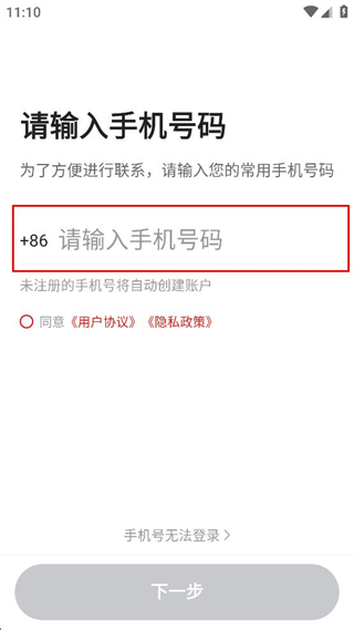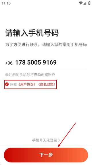 3、確認手機號碼填寫正確且協(xié)議已勾選后,找到界面底部的“下一步”按鈕,點擊該按鈕繼續(xù)操作。
