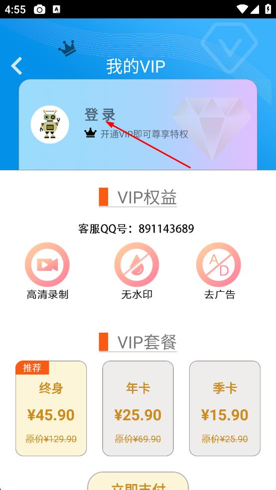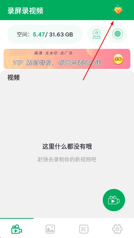 1、打開錄屏錄視頻APP,點(diǎn)擊右上角鉆石圖標(biāo),進(jìn)入我的VIP頁面。