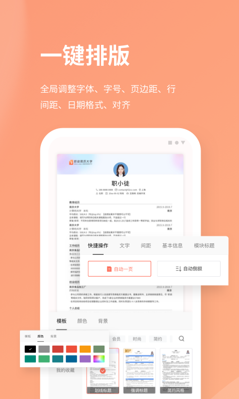支持簡歷導(dǎo)入,一鍵自動一頁簡歷,一鍵將所有經(jīng)歷自動倒敘,一鍵對全局的行距、頁邊距、顏色風(fēng)格等進行統(tǒng)一切換,多種簡潔風(fēng)格樣式,適用于用戶不同的投遞場景。