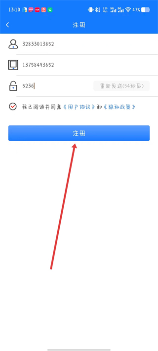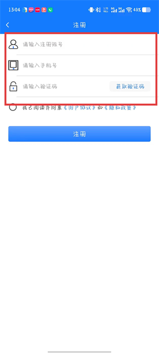 3、輸入注冊賬號、手機號,輸入獲取的驗證碼。
