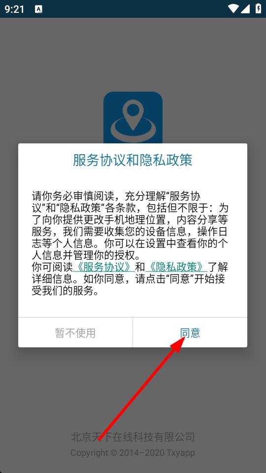 1、打開(kāi)天下游應(yīng)用,在彈出的服務(wù)協(xié)議和隱私政策界面,點(diǎn)擊同意,進(jìn)入應(yīng)用主界面。