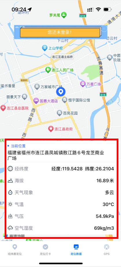 4、如果需要查看定位詳細(xì)信息,回到主界面點(diǎn)擊定位數(shù)據(jù),就能看到當(dāng)前位置的經(jīng)緯度、海拔、天氣現(xiàn)象、氣溫等相關(guān)數(shù)據(jù)。