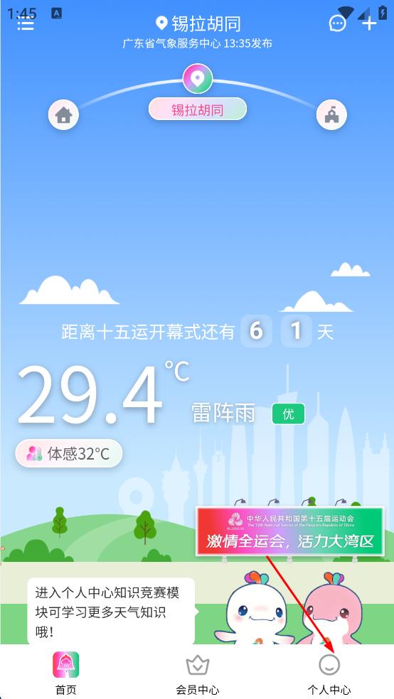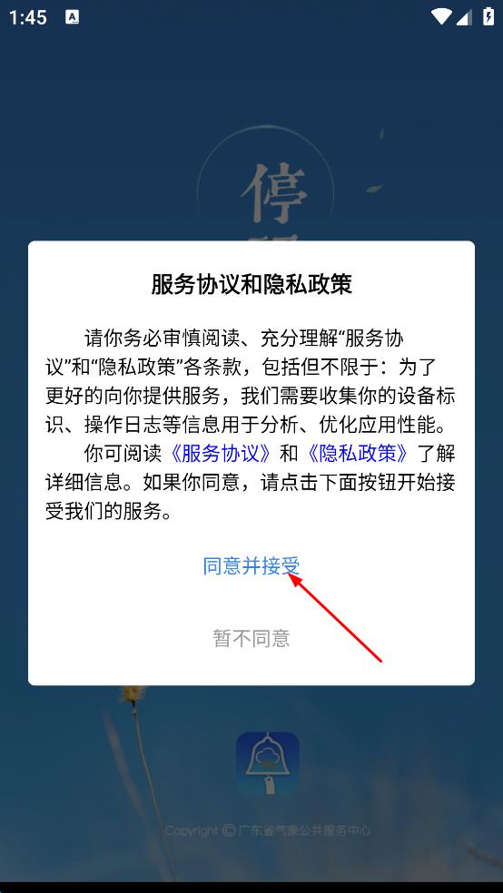 1、打開天氣類APP,在彈出的服務(wù)協(xié)議和隱私政策頁面,點擊同意并接受,進入APP主界面后,點擊右下角個人中心。