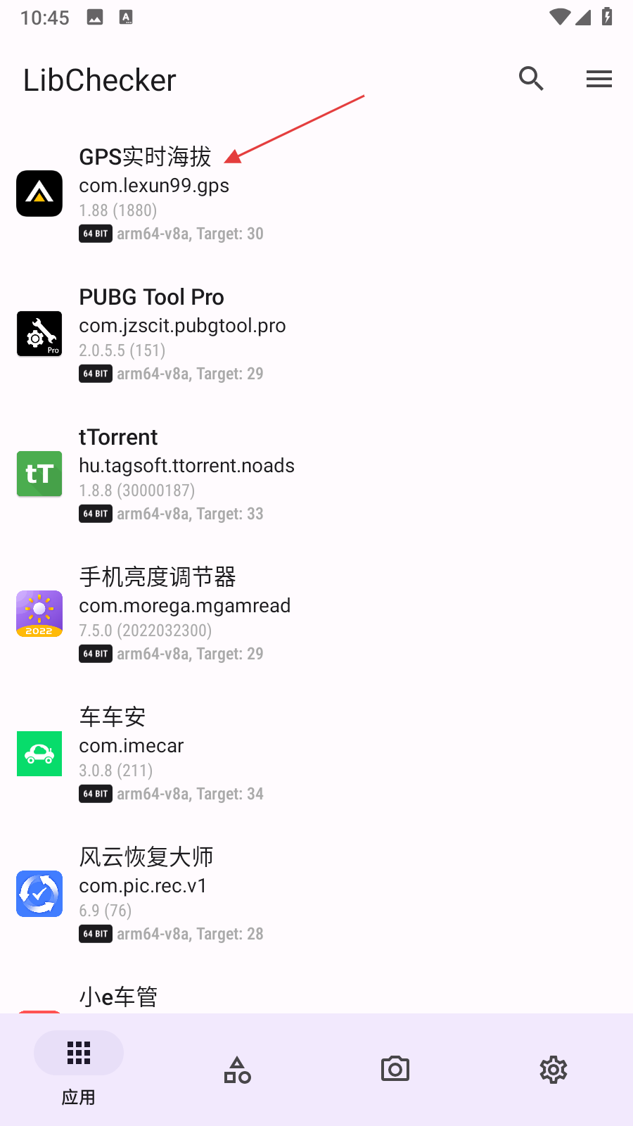 1、打開LibChecker應(yīng)用,點(diǎn)擊進(jìn)入應(yīng)用頁面,頁面展示手機(jī)已安裝的所有應(yīng)用列表,找到需要查看的應(yīng)用并點(diǎn)擊。