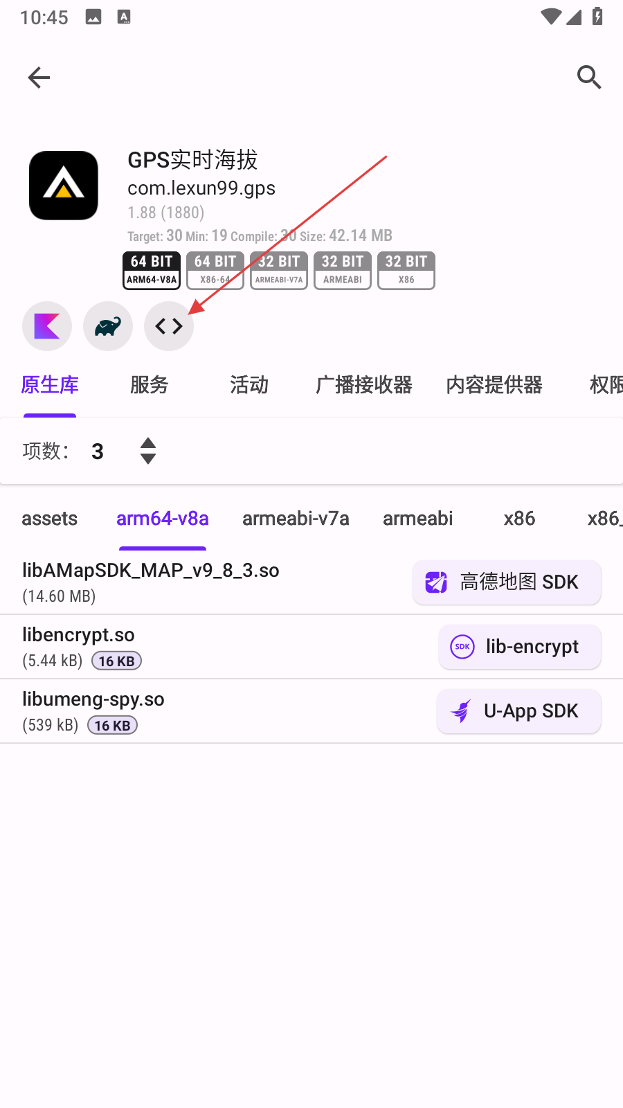 2、進(jìn)入應(yīng)用詳情頁,可查看該應(yīng)用的原生庫架構(gòu),點(diǎn)擊兩個箭頭的圖標(biāo)。