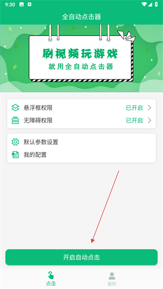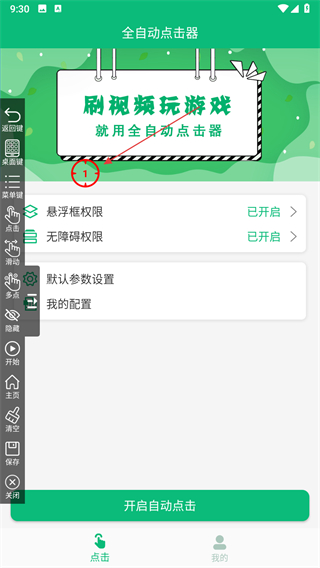 1、打開全自動(dòng)點(diǎn)擊器應(yīng)用,點(diǎn)擊開啟自動(dòng)點(diǎn)擊按鈕。
