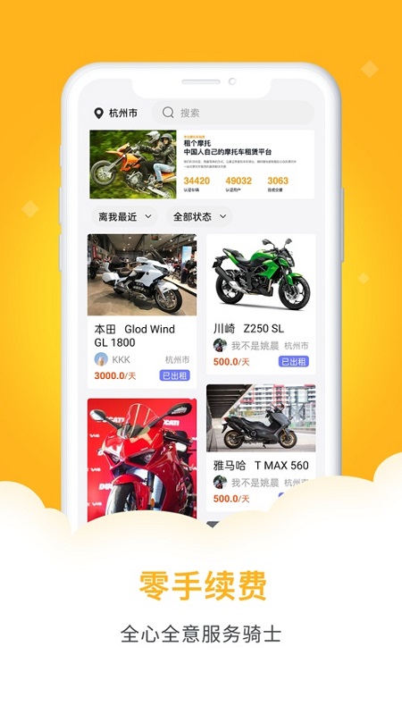 租個摩托摩托車租賃軟件是基于廣大摩友的需求孕育而生的一款租賃平臺軟件,用戶下單后可以直接和車主進行溝通,平臺幫助用戶完成提車、用車、還車、救援等一條龍服務。