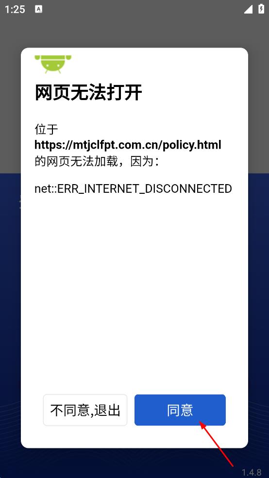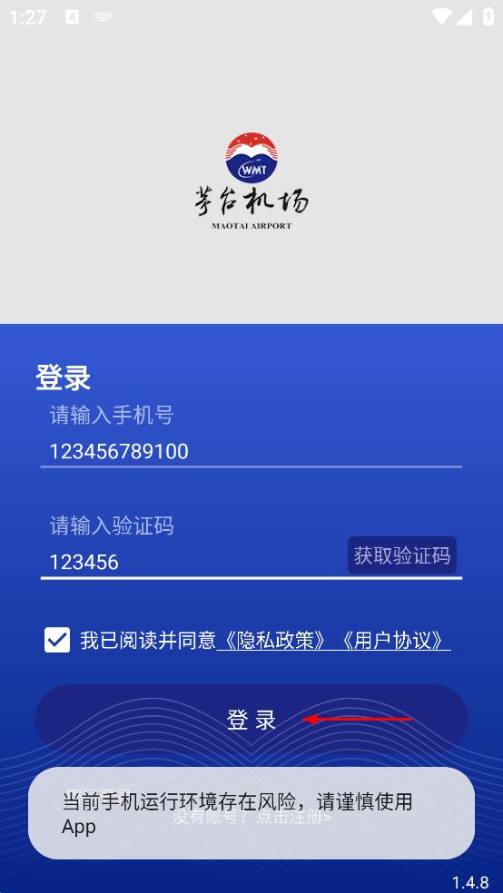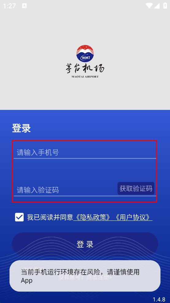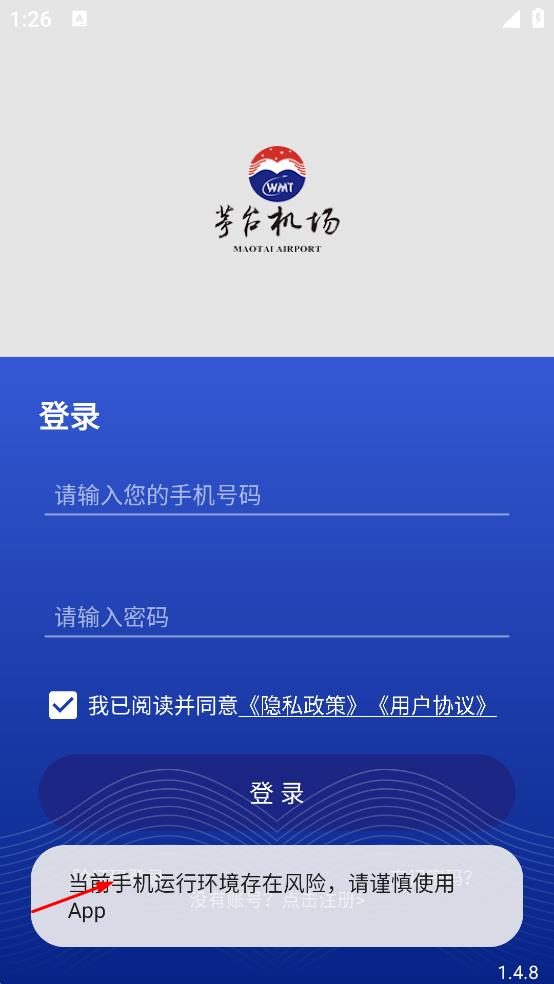 1、打開(kāi)茅臺(tái)機(jī)場(chǎng)APP,出現(xiàn)網(wǎng)頁(yè)無(wú)法打開(kāi)提示框,點(diǎn)擊“同意”,進(jìn)入登錄頁(yè)面。