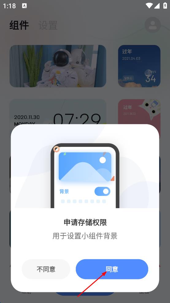 3、在申請存儲權(quán)限彈窗中,點擊“同意”按鈕,授予權(quán)限后,組件將成功添加至手機(jī)桌面。