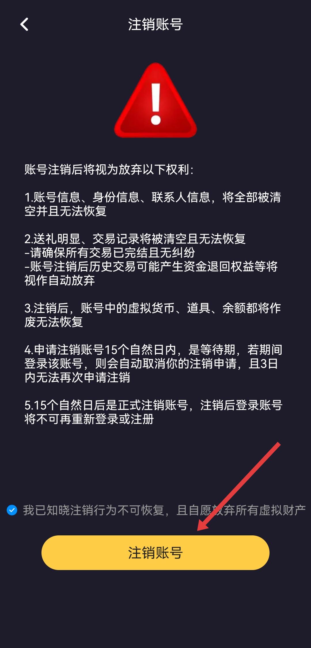 4、在注銷賬號頁面,勾選我已知曉....后,點擊注銷賬號按鈕,完成賬號注銷操作。