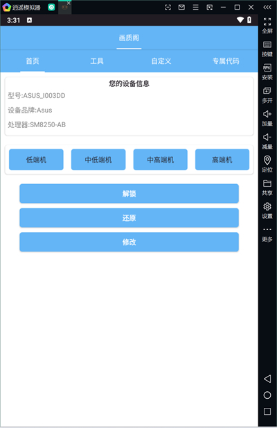 1、打開畫質(zhì)閣軟件后,在首頁的位置可以查看自己的設(shè)備信息,點(diǎn)擊解鎖選項可以解鎖當(dāng)前手機(jī)的配置;