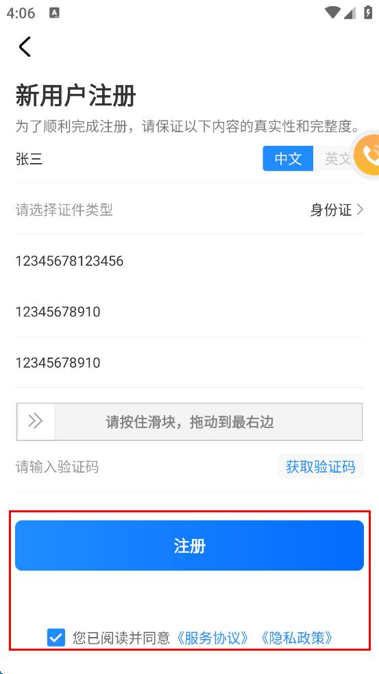 4、按住滑塊拖動(dòng)到最右邊完成驗(yàn)證,勾選您已閱讀并同意服務(wù)協(xié)議,隱私政策,然后點(diǎn)擊“注冊”按鈕。
