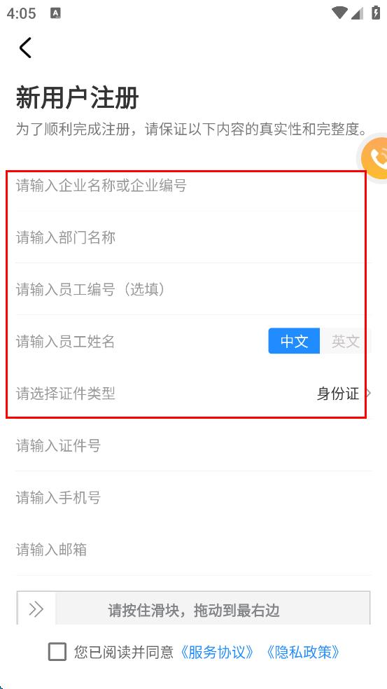 2、在新用戶注冊頁面,依次輸入企業(yè)名稱或企業(yè)編號(hào)、部門名稱、員工姓名等信息。